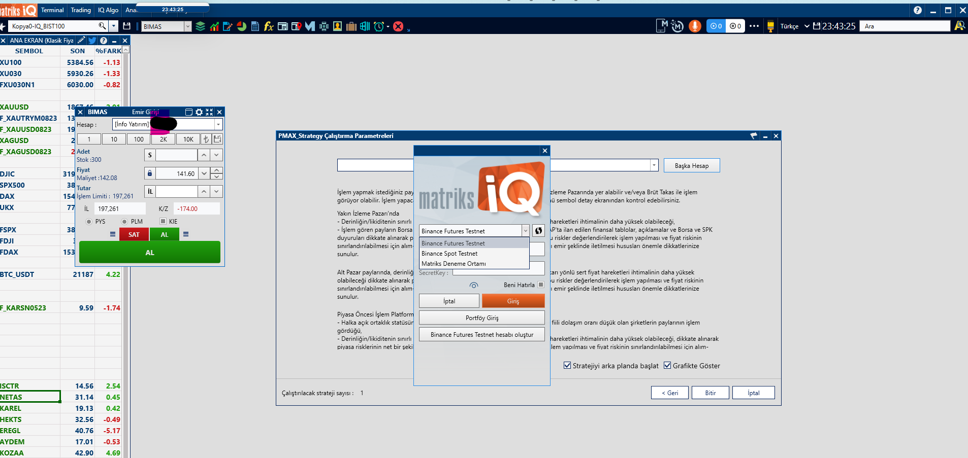 IQ Algo lisansı olmadığında çalıştırma ekranında sadece test hesapları görülür
