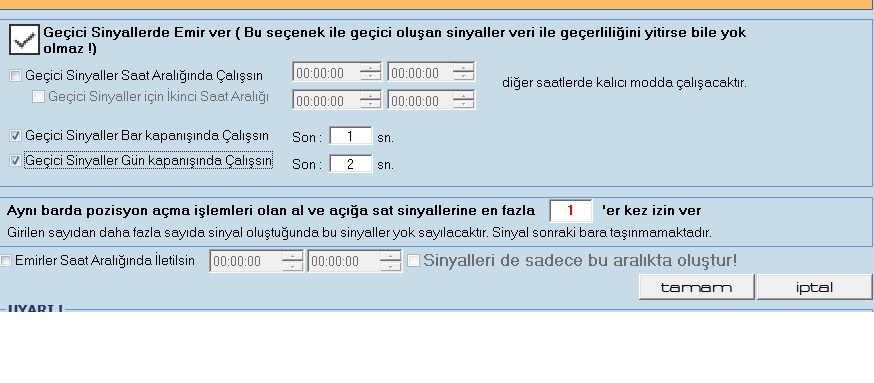 Kendi soruma kendim cevap vereyim. Bist 30 spot saatlik grafikte sistem çalıştırıp viopa bağladım emir için. Bar kapanmasına 1sn kala da geçici sinyal ayarladım. Gün içersinde saat kapanışlarına 1 sn kala sinyal gelirse işlem yapıyor sorun yok. Ancak son barda yani 18 den sonra oluşan barda emir gitmedi. Oraya nasıl bir çözüm bulabiliriz?