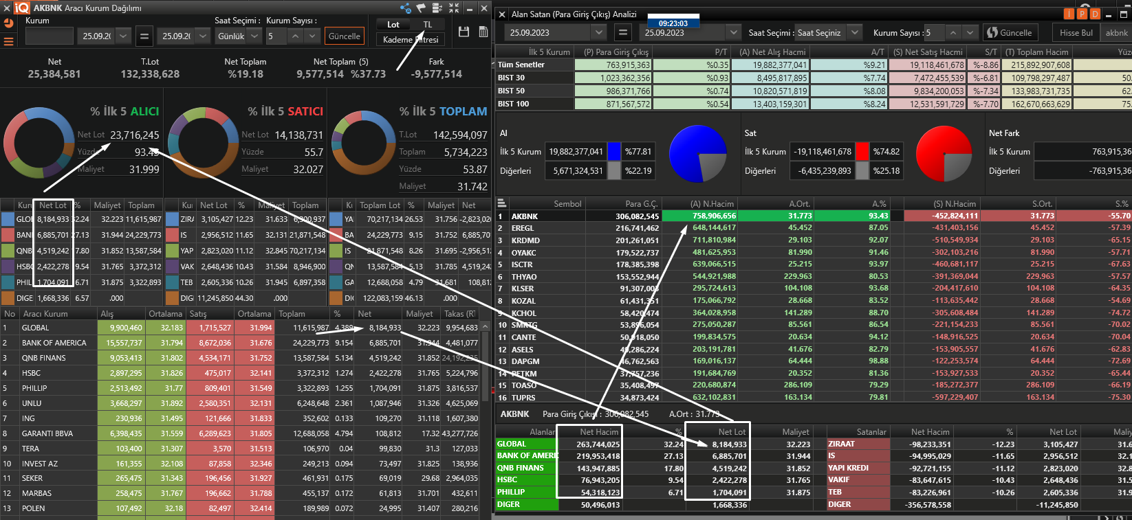 Örneğin 25.09.2023 tarihi itibariyle, AKBNK hissei için aracı kurum raporu alındığında, ilk 10 para girişi olanlara bakınca GARANTI kurumundan  net 108,812 lot alım görünen bir satır var fakat para giriş çıkış raporunda AKBNK için giriş yapan tarafına baktığımda böyle bir satır yok ve AKD de görünen 10. ve 11. satırlar para giriş çıkış raporunda görünüyor.
