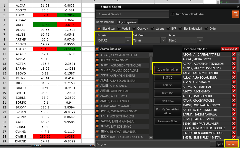 Bist100 endeksinde yer alan ilk hisseyi çağırmak için aşağıdaki komutu kullanıyoruz. Benzer şekilde hisseleri, bu kez XHARZ endeksinden de çağırmak istersek formülü nasıl revize etmek gerekir? Denemelerim oldu fakat çalıştıramadım.