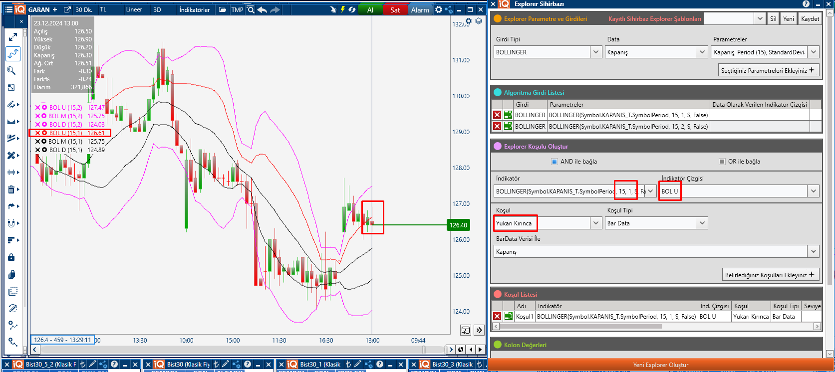 Çift bollinger bandına göre matriks ıq da tarama yapmak istiyorum.