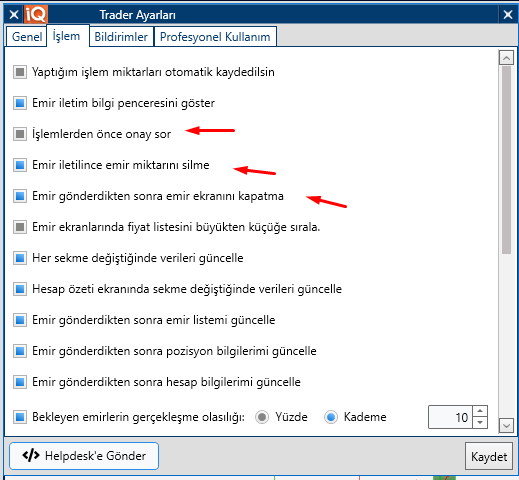 Matriks prime da hızlı emir tanımlaması yapıp emir gönderirken sorgu ekranlarını kapama, son emir adedinin kalması, emir ekranının kapanmaması gibi seçeneklerimiz mevcuttu. Matriks iq da bu ayarları bulamadım. Her emir gönderiminde onay soruyor ve emir ekranı kapanıyor. Bu ayarlar var mı?