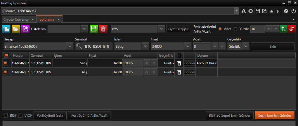 Ben BTC güncel fiyatı 34bin iken, fiyat 35bin dolara çıkarsa alım yap ve fiyat 36bin dolara çıkarsa sat emrini oluşturmak istiyorum.Ancak sadece alım emri oluşuyor.Fiyat şuan 34bin ve 35 bine ulaşırsa alım yapacak ama ben önceden ayarlayıp 35binde almasını 36binde satmasını istiyorum ancak haliyle hesabımda BTC olmadığı için insufficient balance uyarısı alıyorum.